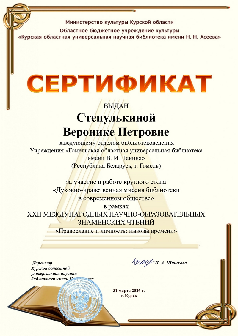 31 марта заведующий отделом библиотековедения Гомельской областной библиотеки Вероника Степулькина с докладом «Духовно-нравственное просвещение населения в публичных библиотеках Гомельщины» приняла участие в работе круглого стола «Духовно-нравственная миссия библиотеки в современном обществе», который состоялся в рамках XXII Международных научно-образовательных Знаменских чтений «Православие и личность: вызовы времени», организованных по благословению митрополита Курского и Рыльского Германа. Среди организаторов – Курская епархия Русской православной церкви, Министерство культуры Курской области, Курская областная универсальная научная библиотека имени Н. Н. Асеева.