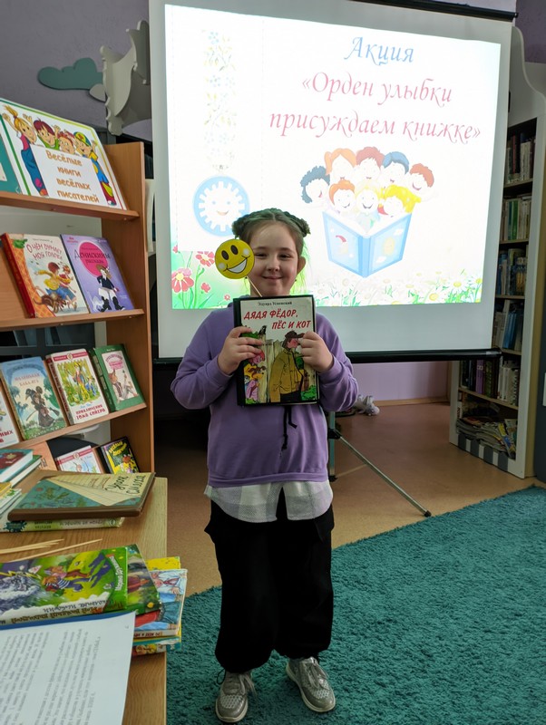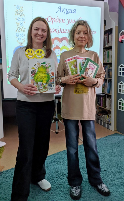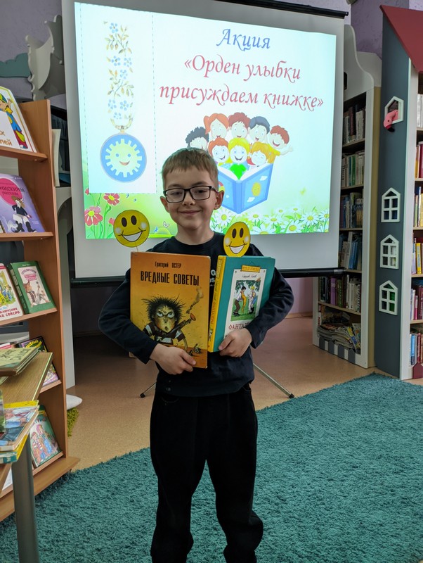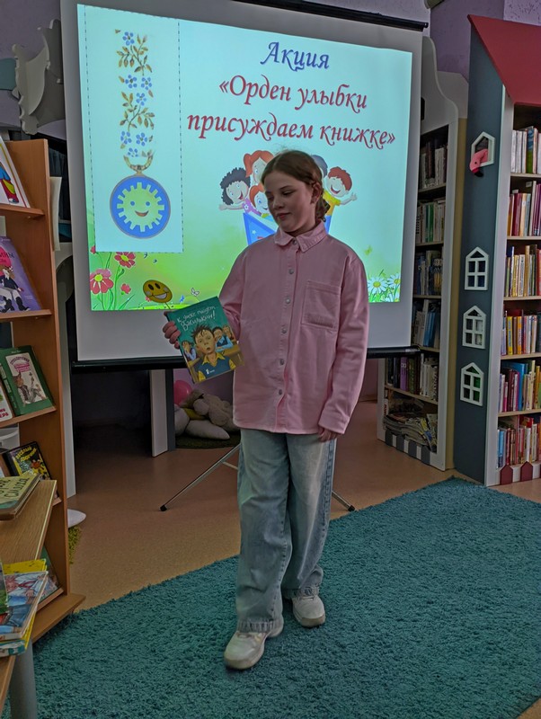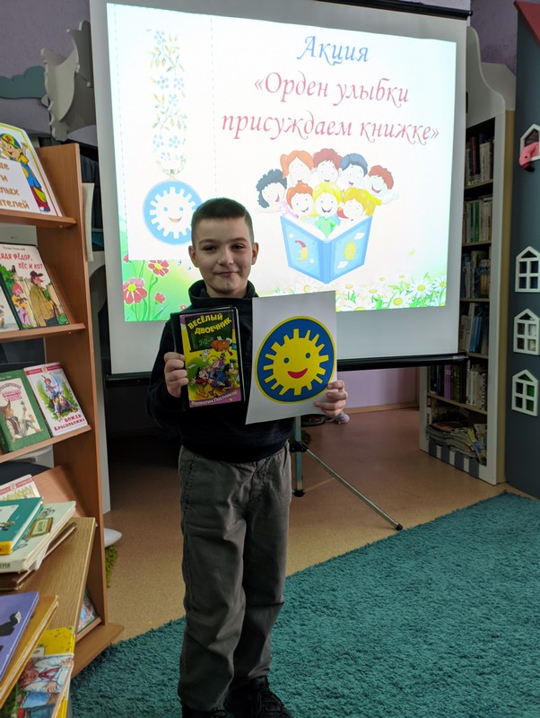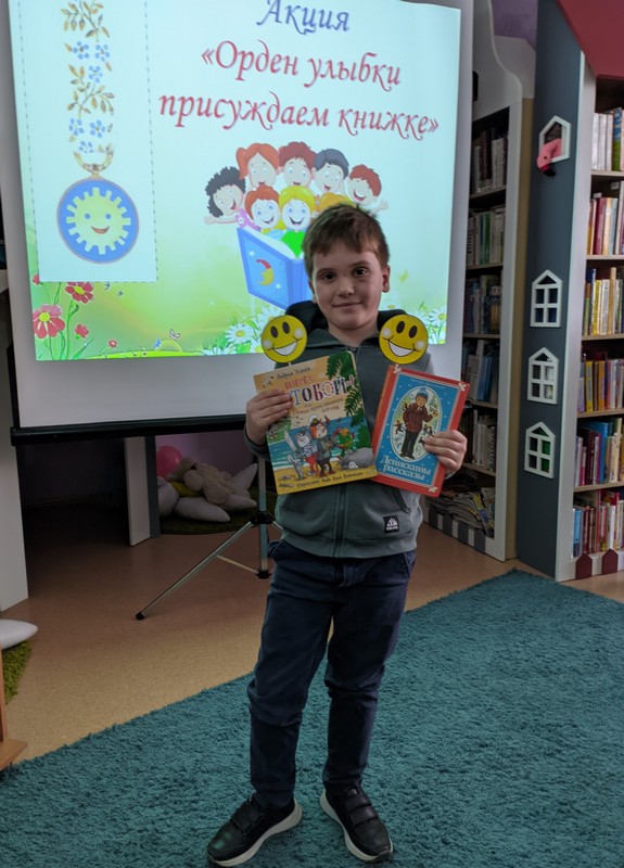 Библиотекарь Валентина Лукьянова познакомила участников с историей появления в 1968 г. уникальной награды – Ордена Улыбки. Орден в виде улыбающегося солнышка присуждается людям, которые несут детям радость и счастье – врачам, детским писателям, музыкантам и деятелям в области благотворительности. С момента основания ордена его рыцарями стали 903 человека из 45 стран. Кавалерами этого ордена стали такие известные личности, как мать Тереза, Астрид Линдгрен, Туве Янссон, Чингиз Айтматов, детские писатели Агния Барто, Сергей Михалков, мультипликатор Вячеслав Котёночкин и другие. Ребята вместе с родителями побывали в роли жюри и вручили свою читательскую улыбку любимым книгам. Каждый хотел доказать, что выбранная им книга – самая-самая.