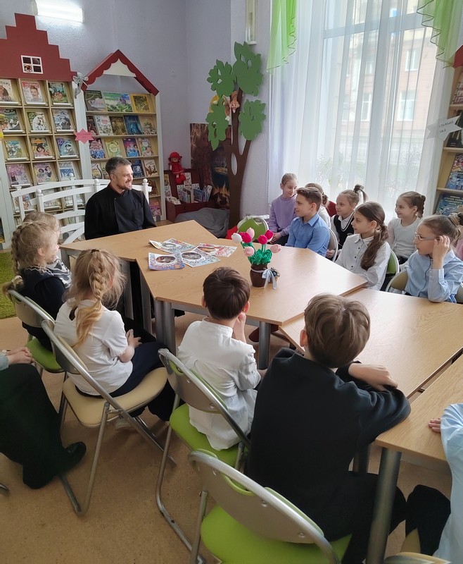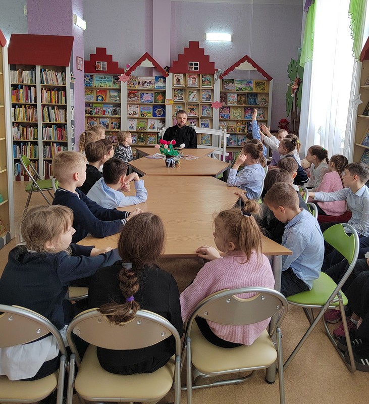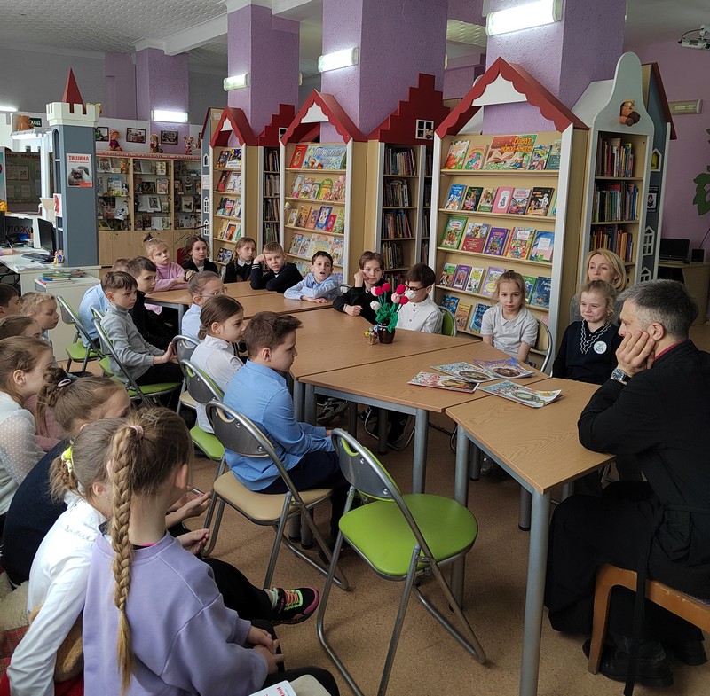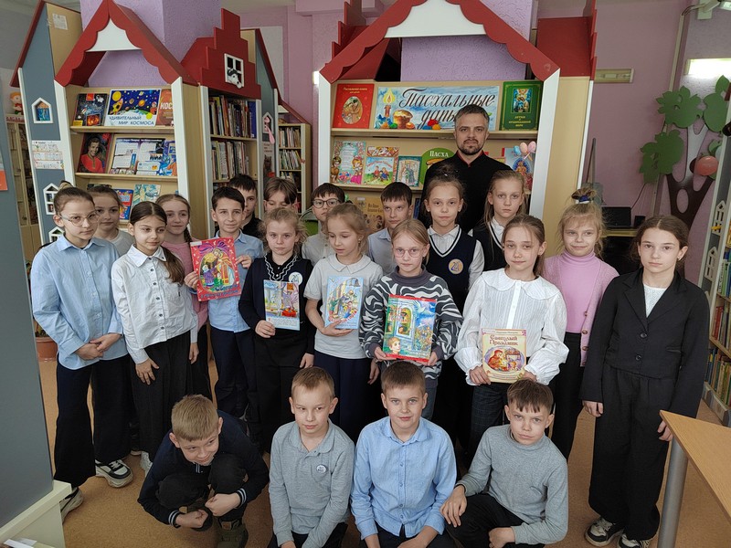 13 апреля во второй день Пасхи в отделе обслуживания учащихся 1–5 классов состоялась беседа о Пасхе с четвероклассниками СШ № 24 клирика Свято-Петро-Павловского собора иерея Иоанна Зайца. Юные читатели познакомились с историей празднования Пасхи, узнали, как к ней готовятся, когда отмечают, поговорили о традициях. Отец Иоанн ответил на многочисленные вопросы ребят: почему красят яйца, пекут куличи, как определить, когда в следующем году наступит этот праздничный день.