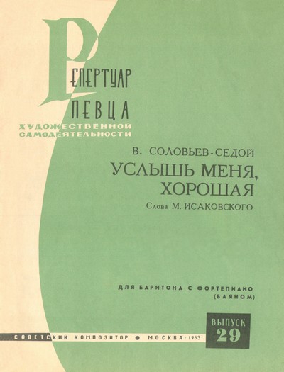 Услышь меня, хорошая [Ноты]: для баритона с фортепиано (баяном) \ Валентин Павлович Соловьёв-Седой. – Москва: Советский композитор, 1963. – 12 с.