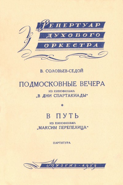 Подмосковные вечера [Ноты]: из кинофильма «В дни спартакиады»; В путь: из кинофильма «Максим Перепелица» / В. П. Соловьёв-Седой. – Партитура и голоса. – Москва: МУЗГИЗ, 1959. – 36 с.