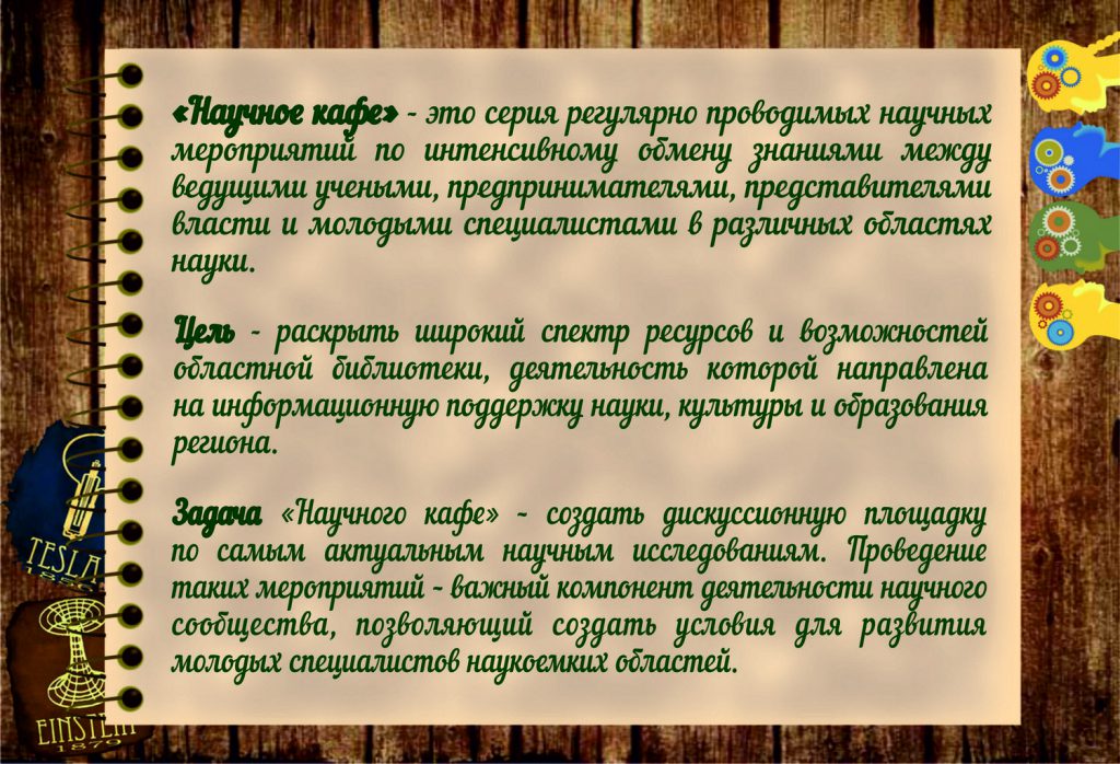 26 января 2017 года состоялось первое заседание «Научного кафе» – дискуссионного клуба, открытого в Гомельской областной библиотеке. И вот уже проект отмечает свой пятилетний юбилей. За прошедшие годы прошли обсуждения тем, которые волнуют всех и каждого. Лекторами и экспертами научного кафе были как известные, заслуженные учёные города и страны, так и молодые увлечённые исследователи. Замысел и цель проекта – сделать науку доступной каждому – осуществились благодаря компетентным, универсально образованным, интеллигентным и высококвалифицированным лекторам. Примите искреннюю благодарность от всех участников заседаний.