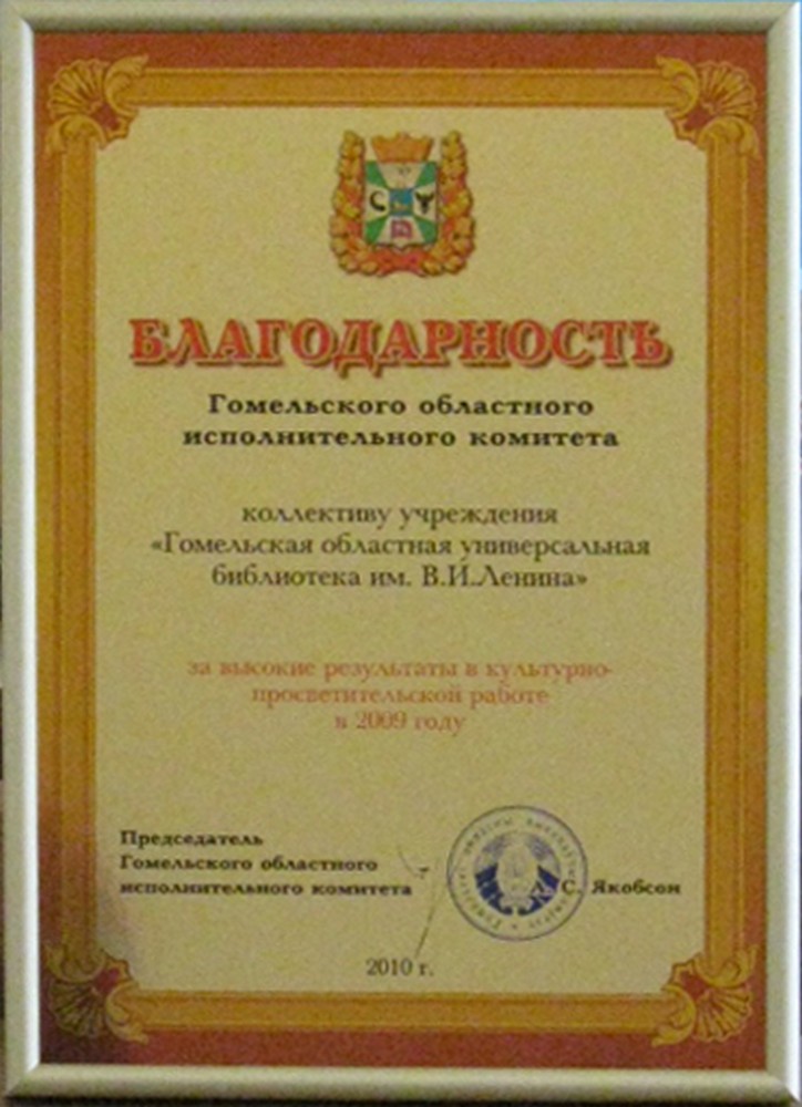 Гомельского областного исполнительного комитета коллективу учреждения «Гомельская областная библиотека им. В.И. Ленина» за высокие результаты в культурно-просветительской работе в 2009 году.