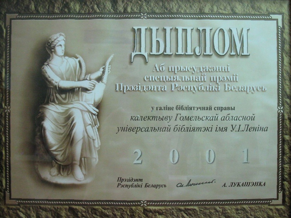 узнагароджваецца калектыў установы «Гомельская абласная ўніверсальная бібліятэка імя У. І. Леніна» за высокі прафесіяналізм, значны ўклад у развіццё бібліятэчнай галіны, актыўную грамадска-культурную дзейнасць