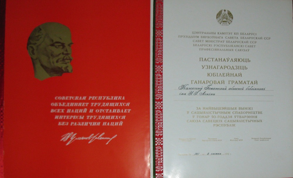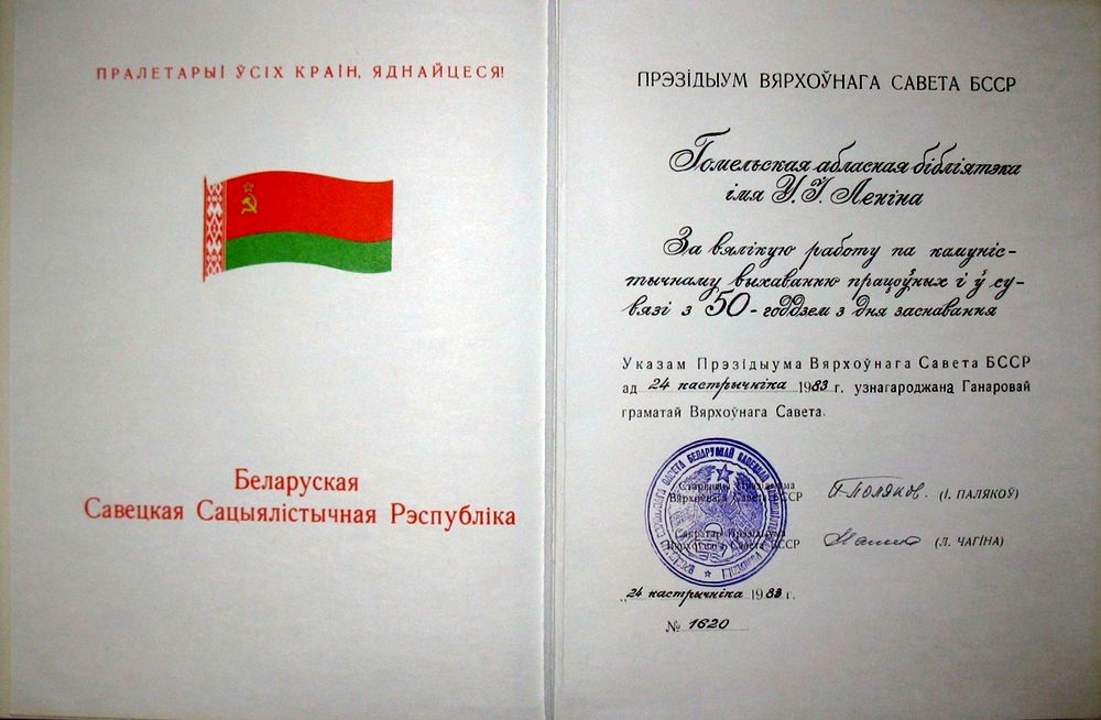 пастанаўляюць узнагародзіць юбілейнай граматай калектыў Гомельскай абласной бібліятэкі імя У.І. Леніна за найвышэйшыя вынікі ў сацыялістычным спаборніцтве ў гонар 50-годдзя ўтварэння Саюза Савецкіх Сацыялістычных Рэспублік