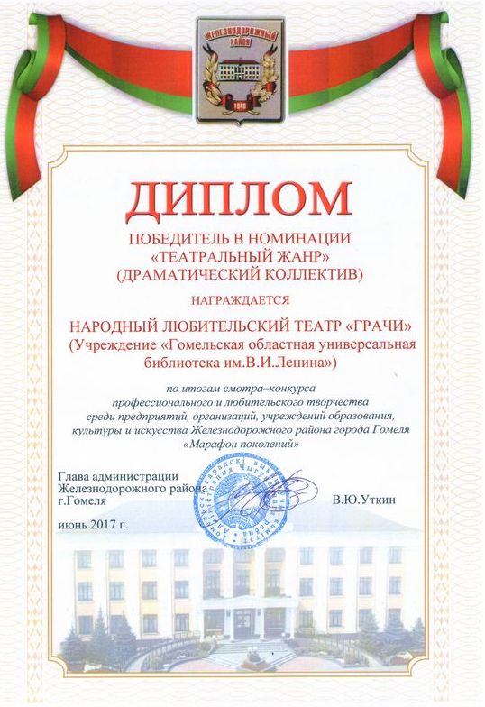 награждается народный любительский театр «Грачи» (Учреждение «Гомельская областная универсальная библиотека им. В.И. Ленина») по итогам смотра-конкурса профессионального и любительского творчества среди предприятий, организаций, учреждений образования, культуры и искусства Железнодорожного района г. Гомеля «Марафон поколений»