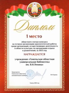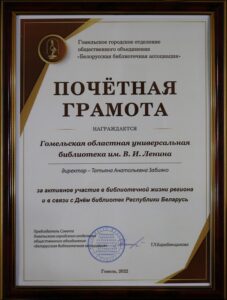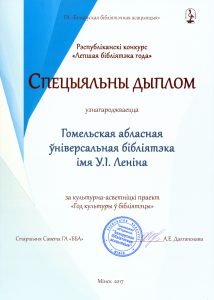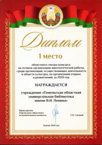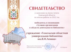победитель в номинации «Лучшая организация в области деятельности библиотек» учреждение «Гомельская областная универсальная библиотека им. В.И. Ленина»