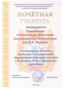 узнагароджваецца Гомельская абласная ўніверсальная бібліятэка імя У. І. Леніна