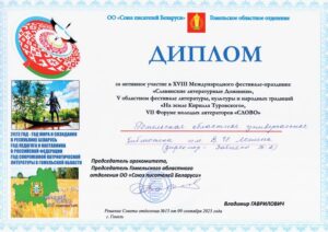за активное участие в XVIII Международном фестивале-празднике «Славянские литературные Дожинки», V Областном фестивале литературы, культуры и народных традиций «На земле Кирилла Туровского», VII Форуме молодых литераторов «Слово»