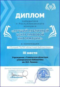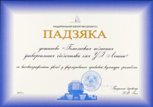 установе «Гомельская абласная ўніверсальная бібліятэка імя У.І. Леніна» за высокапрафесійны ўклад у фарміраванне прававой культуры грамадзян
