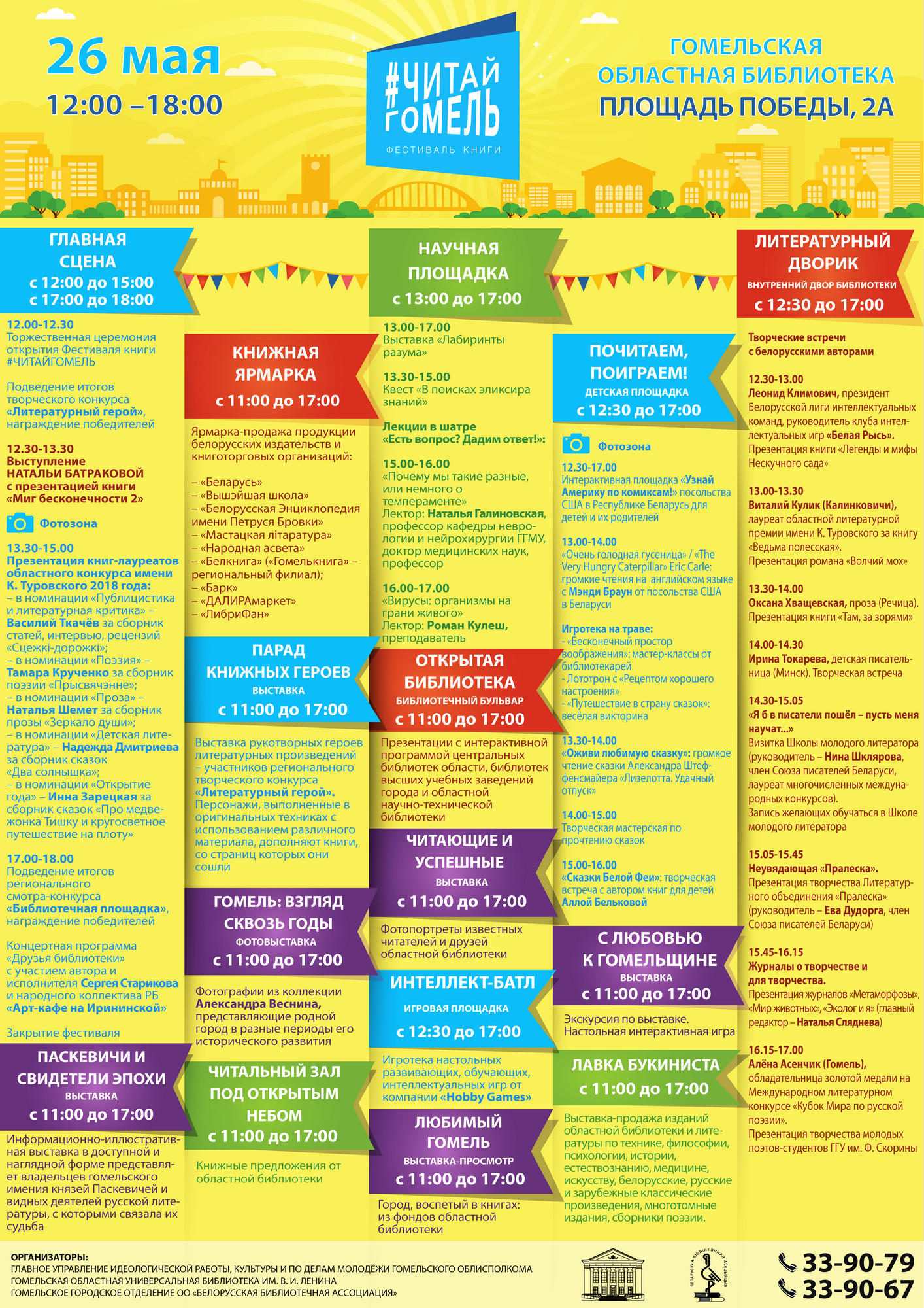 Фестиваль книги-2019 Автор: admin · Опубликовано 20.05.2019 · Обновлено 27.05.2019 Второй фестиваль книги пройдет 26 мая с 12:00 до 18:00 в Гомельской областной библиотеке. Поделиться: