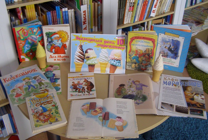 Отвечая на вопросы викторины, ребята вспоминали книги, где упоминается любимое лакомство: «Эскимо» С. Георгиева, «Праздник непослушания» С. Михалкова, «Незнайка в Солнечном городе» и «Фантазёры» Н. Носова, «Мороженое» С. Маршака, «Дед Мороз и лето» В. Ливанова, «Муфта, Полботинка и Моховая борода» Э. Рауд, «Квак и Жаб круглый год» А. Лобела, «Опасное мороженое» Г. Остера.