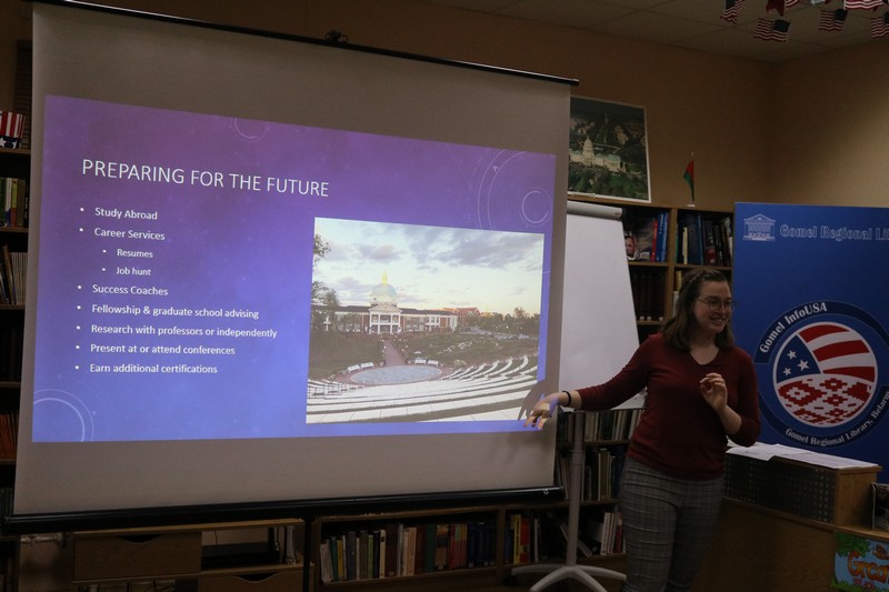Программу этого интересного и насыщенного дня открыли экскурсии по городу и библиотеке для нашей гостьи. В областной библиотеке Кендал Карстенс провела две презентации. О своей студенческой жизни в университете Северной Каролины Хай Поинт, о некоторых интересных фактах об образовании в США она рассказала в своём выступлении «Моя альма-матер» для учащихся и студентов Гомеля.