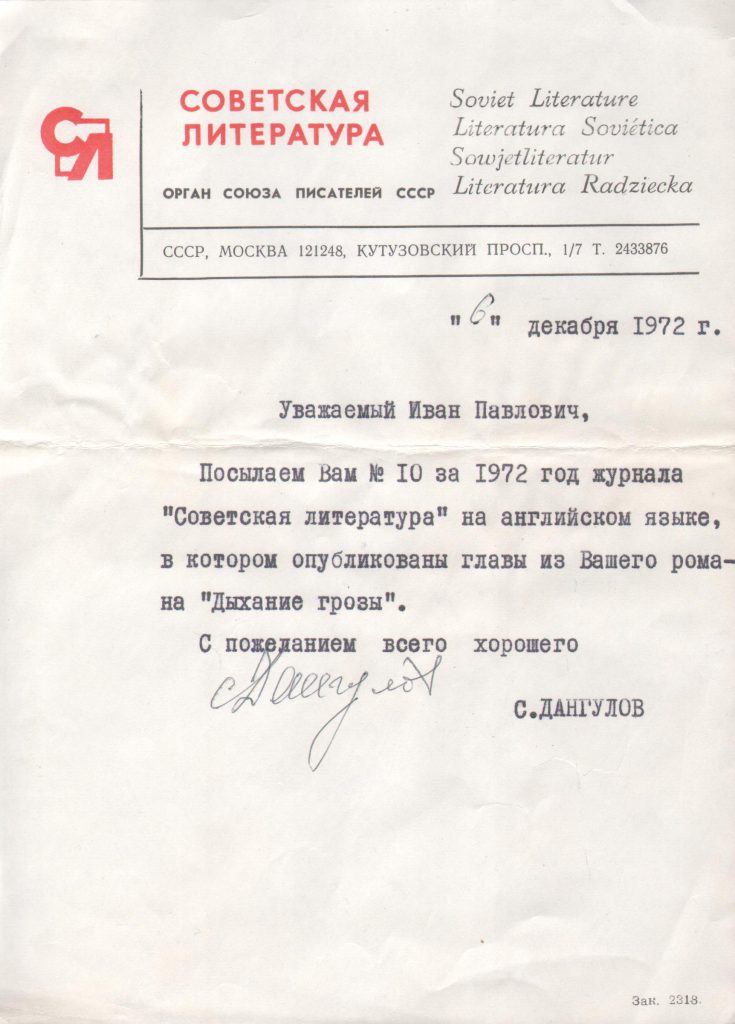 Такой асобай з’яўляецца Іван Паўлавіч Мележ. Больш 30 гадоў ён працаваў на літаратурнай ніве. Яго творчую спадчыну складаюць навелы, апавяданні, дзённікі, п’есы і раманы. Творы Івана Паўлавіча перакладаліся на розныя мовы народаў краін былога Савецкага Саюза і народаў свету. Аб гэтым сведчыць пісьмо галоўнага рэдактара часопіса «Советская литература» Савы Дангулава, якое захоўваецца ў архіве Літаратурнага музея Гомельскай абласной бібліятэкі. У ім гаворыцца аб тым, што ў 10 нумары часопіса надрукаваны главы з рамана «Подых навальніцы» на англійскай мове. (Штомесячны часопіс «Советская литература» выходзіў у Маскве на англійскай, французскай, нямецкай, іспанскай, польскай, чэшскай і славацкай мовах. Яго асноўнай мэтай было знаёмства замежных чытачоў з новымі творамі многанацыянальнай савецкай літаратуры). Пісьмо датавана 6 снежня 1972 г.