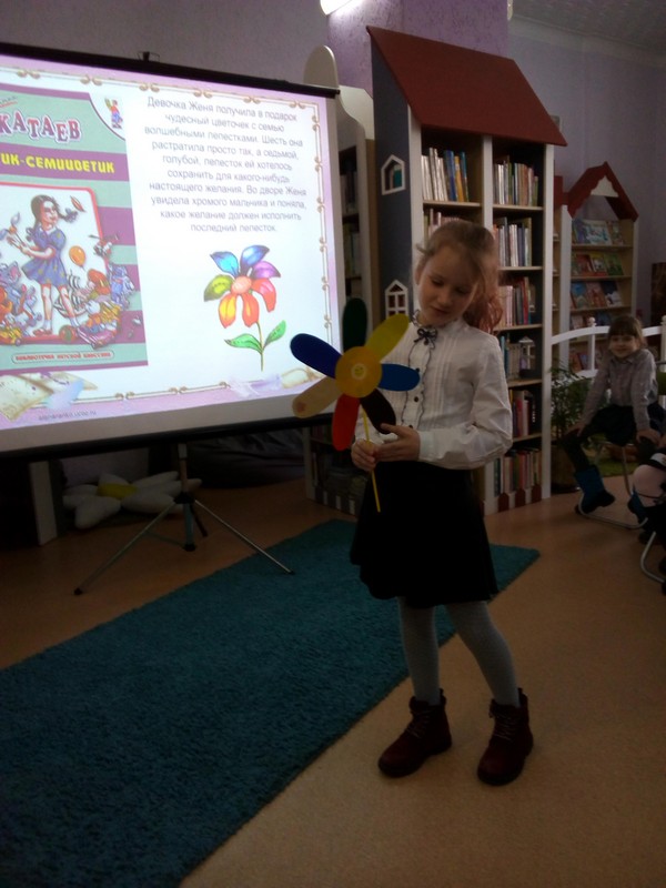 к другу. Обзор книг сопровождался активным обсуждением поступков литературных героев. Вспомнив сказку В. Катаева «Цветик-семицветик», девочки и мальчики наперебой называли добрые дела, которые они совершили бы, владея волшебным цветком.