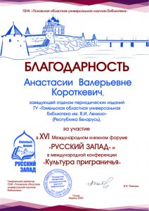 15 апреля заведующая отделом периодических изданий Гомельской областной библиотеки Анастасия Валерьевна Короткевич с докладом «Презентация книги Инессы Плескачевской “Без железного занавеса”» приняла онлайн-участие в Международной конференции «Культура приграничья». Участники конференции проявили большой интерес к вопросам формирования фондов библиотеки, работе по популяризации книги в Гомельском регионе. Знакомство с областной библиотекой, авторами новых книг и литературными новинками вызвали у гостей форума желание посетить наш регион и лично увидеть самые достойные издания крупнейшей библиотеки области.