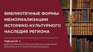 Приветствуя участников конференции, Марина Сергеевна поблагодарила руководство и сотрудников РГБ за искреннюю деятельную поддержку профессиональных инициатив Гомельской областной библиотеки: I Международных Паскевичских чтений в Гомеле, проходивших в 2019 г., и предоставление цифровых копий советских плакатов 20–30-х гг. XX века, посвящённых книге и чтению. Выставка «Товарищ книга» из фондов РГБ будет продемонстрирована на книжном фестивале #ЧИТАЙГОМЕЛЬ 22 мая этого года. На секции «Собиратели, исследователи, хранители. Библиотеки и музеи в контексте истории» Марина Сергеевна представила доклад «Библиотечные формы мемориализации историко-культурного наследия региона», посвящённый раскрытию потенциала мемориальной деятельности библиотеки. На примере отдельных коллекций раскрыты формы мемориализации историко-культурного наследия региона, реализуемые Гомельской областной универсальной библиотекой.