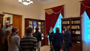 Их вниманию была предложена тематическая экскурсия по Литературному музею «Война в жизни и творчестве народных писателей Беларуси, уроженцев Гомельщины». Сотрудники отдела представили военные дневники Андрея Егоровича Макаёнка, рассказали про его участие в Феодосийско-Керченской операции и тяжёлом ранении обеих ступней ног, которое он получил в одном из боёв; о первом произведении Ивана Петровича Шамякина, написанном на страницах русско-финского словаря, и произведениях писателя, в которых нашли отражение события военного времени.