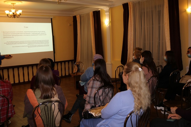 Лектор – молодой учёный, врач-невролог, сомнолог Андрей Павлович Савостин – профессионально раскрыл самые актуальные вопросы бессонницы, проблем засыпания, продолжительности сна. Почему мы видим сны, и как работает в это время наша психика? Как сказывается недосыпание на здоровье человека? Насколько индивидуальна продолжительность сна? Цветные и чёрно-белые сны – игра подсознания или отголоски пережитого дня? На эти и многие другие вопросы получили ответ участники заседания.