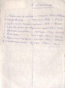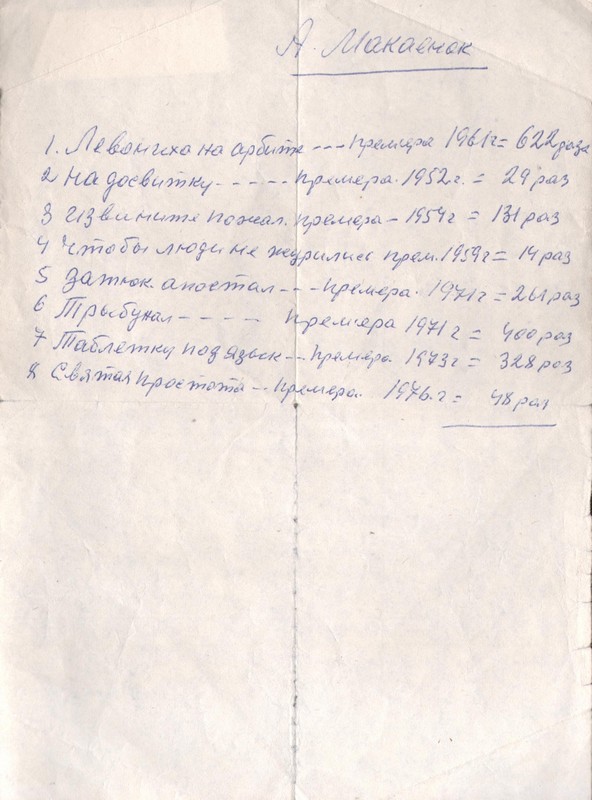 У Мемарыяльнай зале народнага пісьменніка захоўваецца артэфакт, які ўтрымлівае звесткі аб колькасці пастановак п’ес Андрэя Ягоравіча, а таксама год прэм’еры той або іншай п’есы. Як мяркуецца, пералік складзены ў свой час жонкай драматурга Любоўю Іванаўнай Макаёнак.