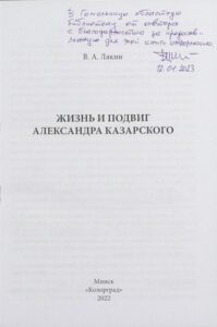 Фонд Гомельской областной библиотеки пополнился авторской книгой Владимира Александровича Лякина «Жизнь и подвиг Александра Казарского», которая вышла в 2022 г. в издательстве «Колорград». В этом издании воспроизведён один из самых известных и ярких эпизодов морских войн – бой 14 мая 1829 г. у пролива Босфор российского брига «Меркурий» против двух турецких кораблей. Командиром этого легендарного судна был уроженец Беларуси Александр Иванович Казарский.