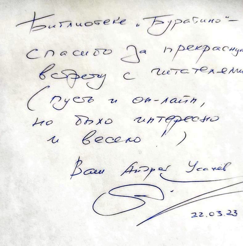 Мы от всей души благодарим Андрея Усачёва за чудесную встречу, а также наших друзей из Московской детской библиотеки № 156 за помощь в организации онлайн-моста с писателем.