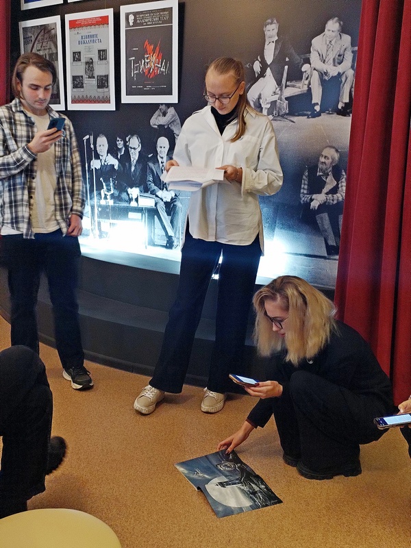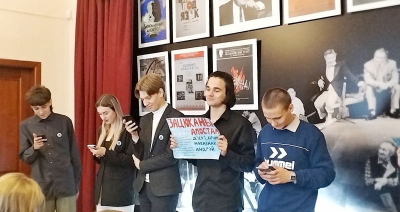 После знакомства с музеем учитель проверил домашнее задание лицеистов –инсценировку отрывка пьесы «Затюканный апостол». Мини-постановка помогла ребятам познакомить с сюжетом произведения одноклассников и проявить свои творческие способности: учащиеся выступили в роли режиссёров-постановщиков, актёров, художников-графиков. В завершение урока они подарили Мемориальному залу афиши, нарисованные специально к инсценировке пьесы.