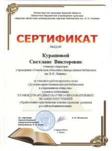 2 апреля учёный секретарь Гомельской областной библиотеки Светлана Курашова приняла участие в работе круглого стола «Духовно-нравственная миссия библиотеки в современном обществе», который состоялся в рамках юбилейных XX Международных научно-образовательных Знаменских чтений «Православно-христианские основы стратегии развития российской цивилизации», организованных по благословению митрополита Курского и Рыльского Германа.