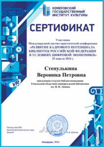 25 апреля заведующий отделом библиотековедения Гомельской областной библиотеки Вероника Степулькина приняла участие в Международной научно-практической конференции «Развитие кадрового потенциала библиотек Российской Федерации в условиях цифровой экономики». Организаторами мероприятия выступили Кемеровский государственный институт культуры, Некоммерческое библиотечное партнерство «Кузбасские библиотеки», Государственная научная библиотека Кузбасса им. В. Д. Фёдорова, Белорусский государственный университет культуры и искусств.