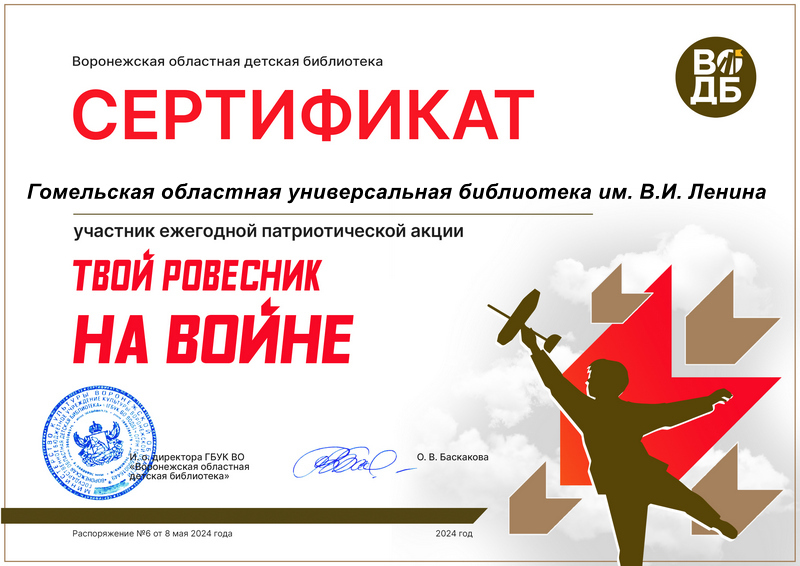 Отдел обслуживания учащихся 1–5 классов Гомельской областной библиотеки присоединился к ежегодной патриотической акции «Твой ровесник на войне», приуроченной ко Дню Победы в Великой Отечественной войне 1941–1945 гг. Основная идея акции, объявленной Воронежской областной детской библиотекой, – чтение книг о Великой Отечественной войне, главными героями которых являются дети и подростки.