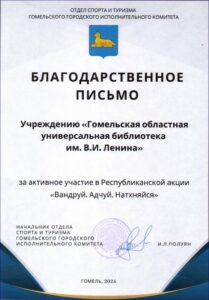 За активное участие в республиканской акции «Вандруй. Адчуй. Натхняйся» учреждение «Гомельская областная универсальная библиотека им. В.И. Ленина» отмечено БЛАГОДАРСТВЕННЫМ ПИСЬМОМ отдела спорта и туризма Гомельского городского исполнительного комитета.