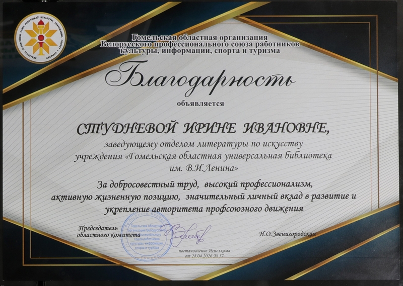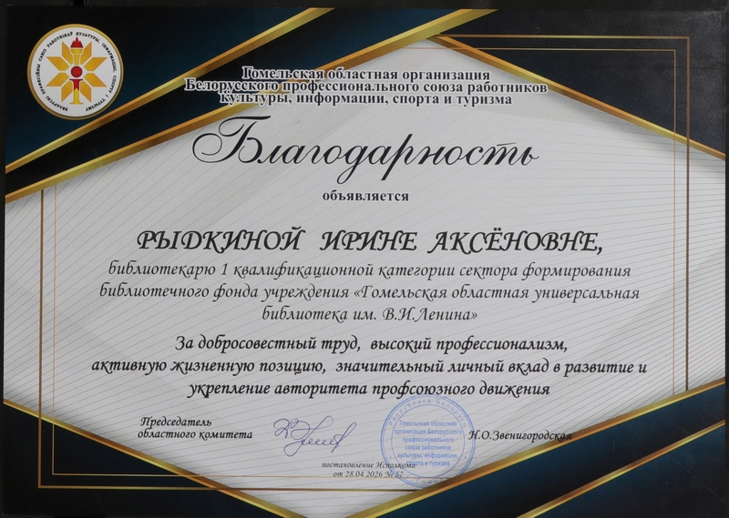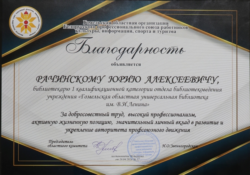 В преддверии Первомая, праздника созидания и уважения к труду, БЛАГОДАРНОСТЬ Гомельской областной организации Белорусского профессионального союза работников культуры, информации, спорта и туризма за добросовестный труд, высокий профессионализм, активную жизненную позицию, значительный вклад в развитие и укрепление авторитета профсоюзного движения объявлена работникам Гомельской областной библиотеки Юрию Рачинскому, библиотекарю 1 кв. категории отдела библиотековедения, Ирине Рыдкиной, библиотекарю 1 кв. категории сектора формирования библиотечного фонда, Ирине Студневой, заведующему отделом литературы по искусству.